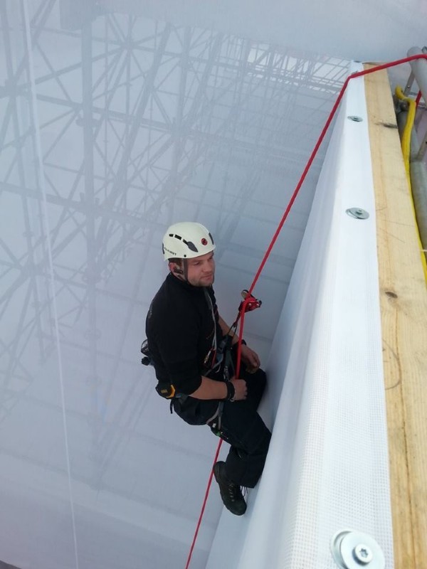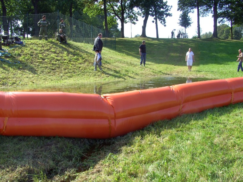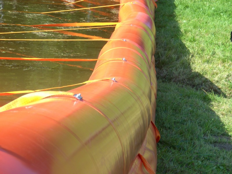 Unser neuartiges System für mobilen Hochwasserschutz besteht im Wesentlichen aus einer PVC-Plane, einem mit Luft gefülltem Schwimmkörper und damit verbundenen Halteleinen und Verankerungen. Wenn das Wasser auf die Plane bis zur Luftkammer strömt, errichtet sich - mit steigendem Pegel - die Barriere selbstständig, indem sich der Schwimmkörper hebt und die Plane mit hochzieht.